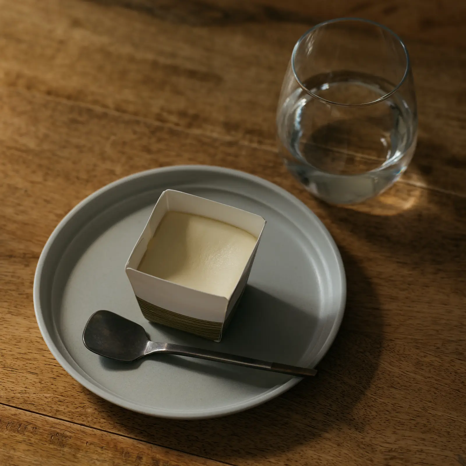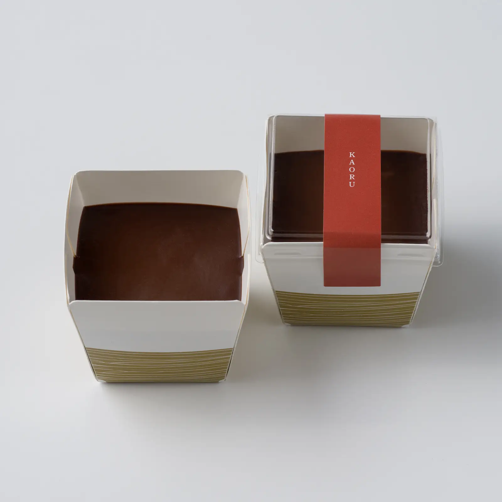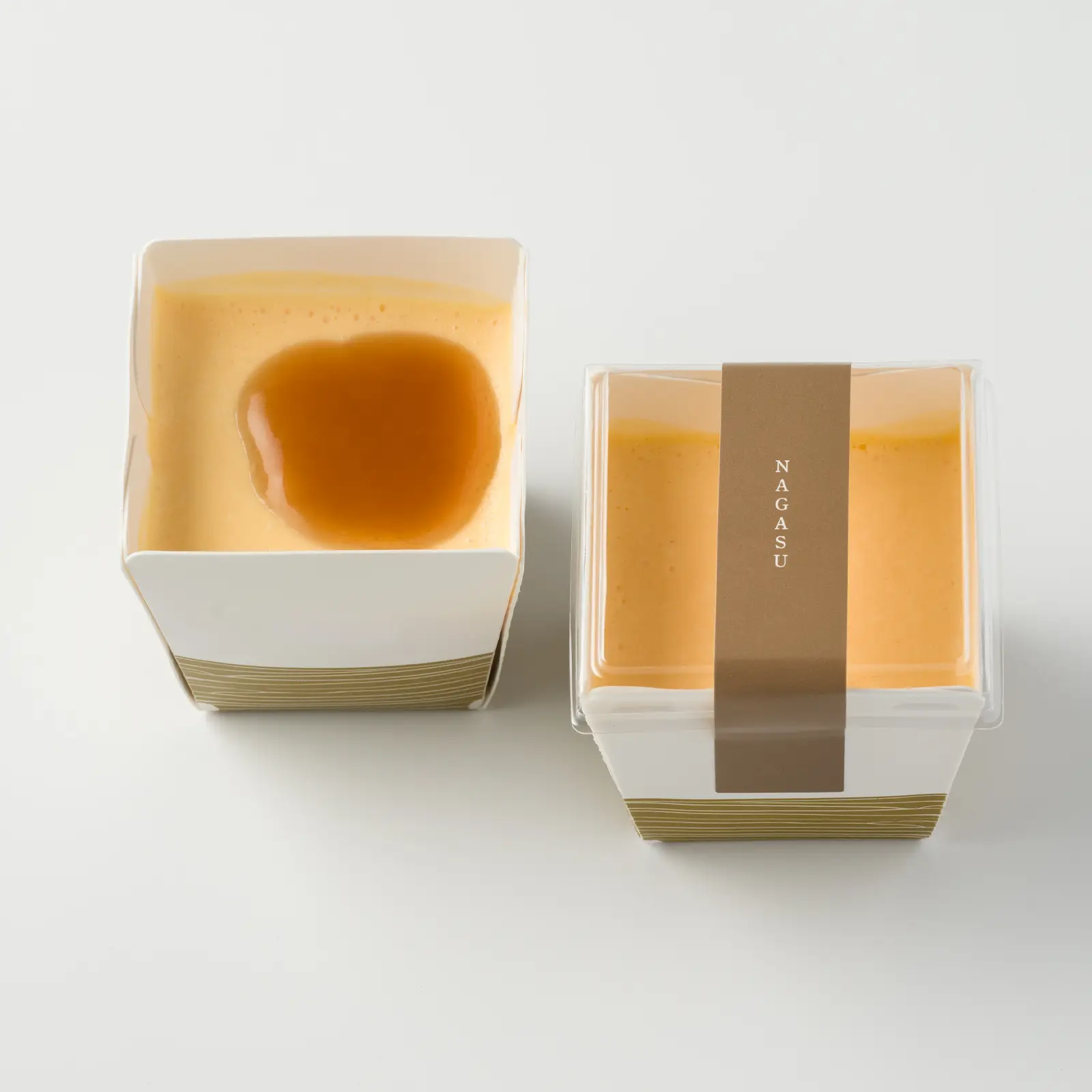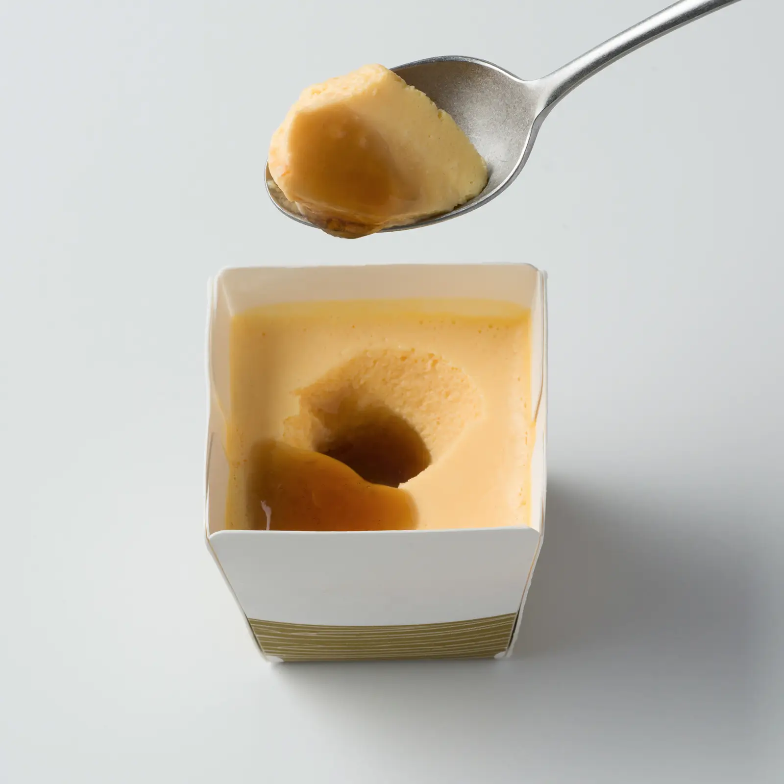 純米大吟醸原酒と純米大吟醸酒粕を使用したプリン。日本酒とカスタード、バニラの香りの意外な組み合わせ。プリンの味わいの後に日本酒の風味がしっかりと感じられます。お好みのタイミングでかけられるカラメルシロップ付き。