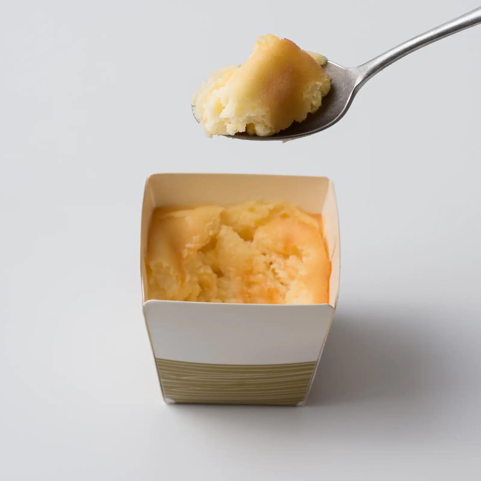 純米吟醸原酒と酒粕を使用したチーズスフレ。やさしい甘さのスフレが口の中でとろけ、日本酒の香りと味わいが広がります。 これこそ、升升一升がご提案する看板商品です。
