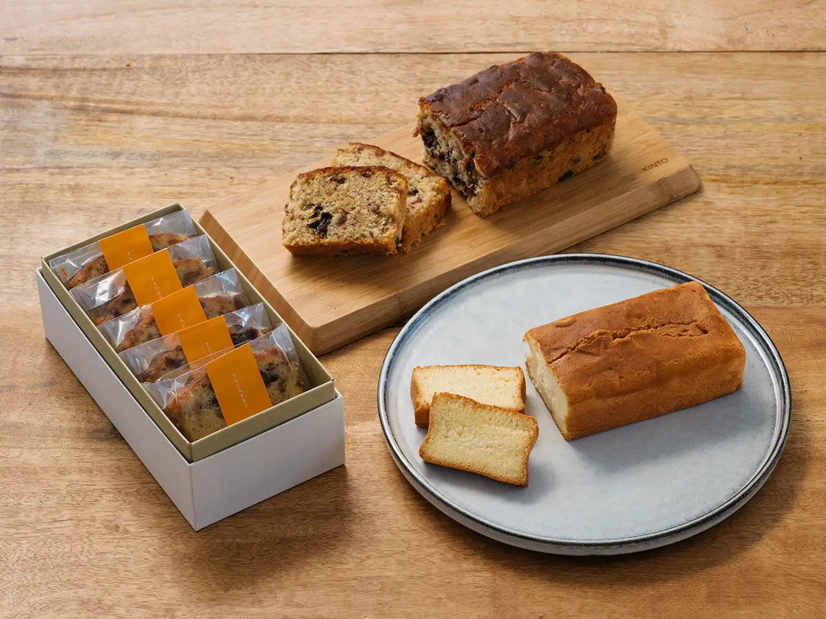 純米大吟醸酒粕を練り込んだバター生地に、純米大吟醸原酒に漬け込んだドライフルーツを合わせて焼き上げ、さらにドライフルーツを漬けた後の清酒を生地に染み込ませたパウンドケーキ。お酒の風味がじんわりと広がる。