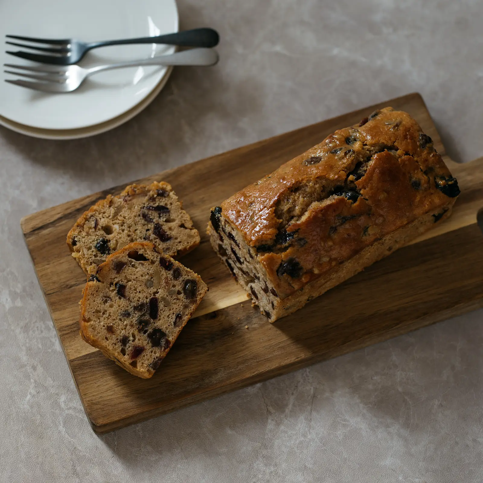 しっとり生地と原酒に漬けた3種のドライフルーツが豊かに香る。